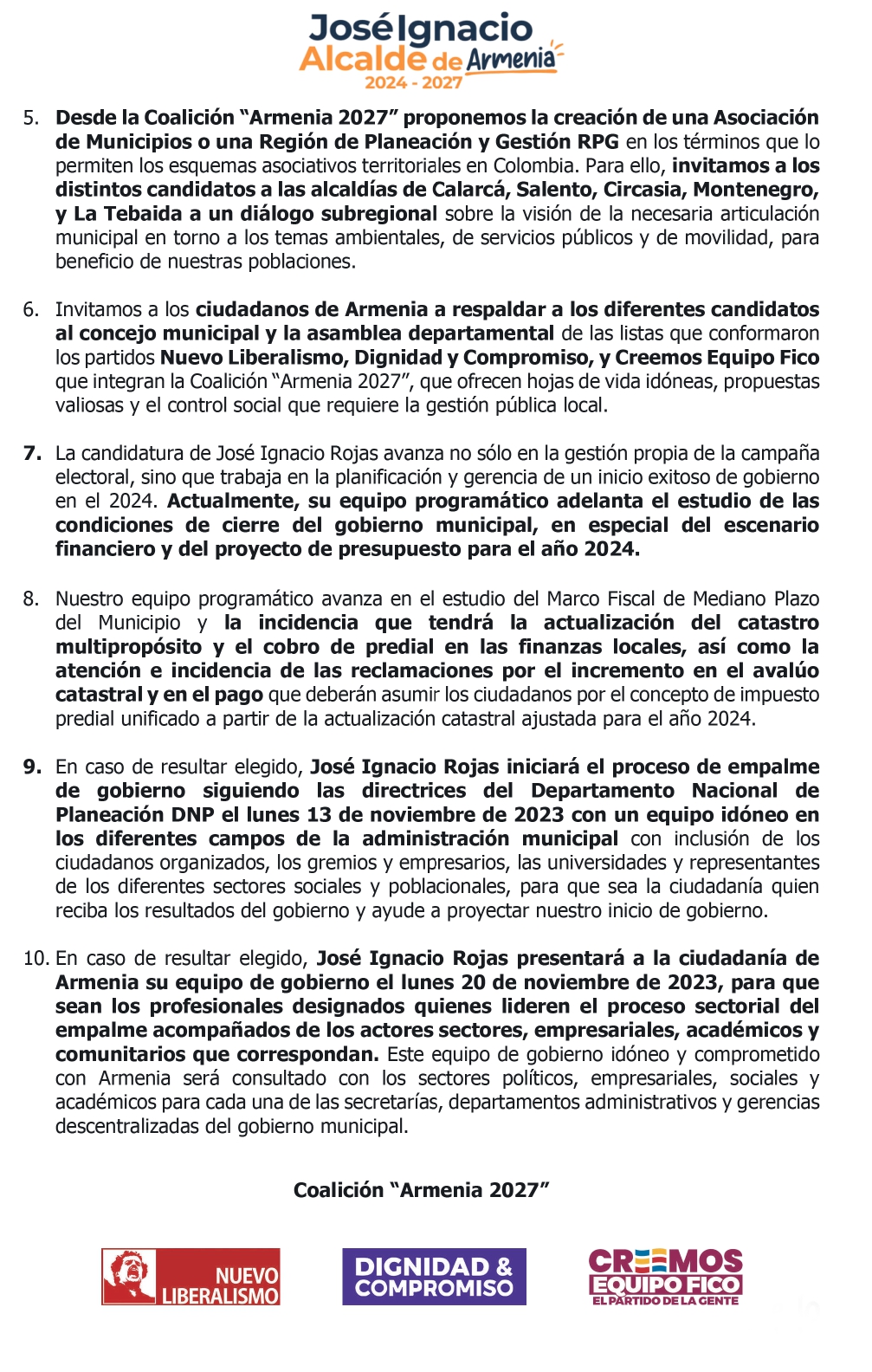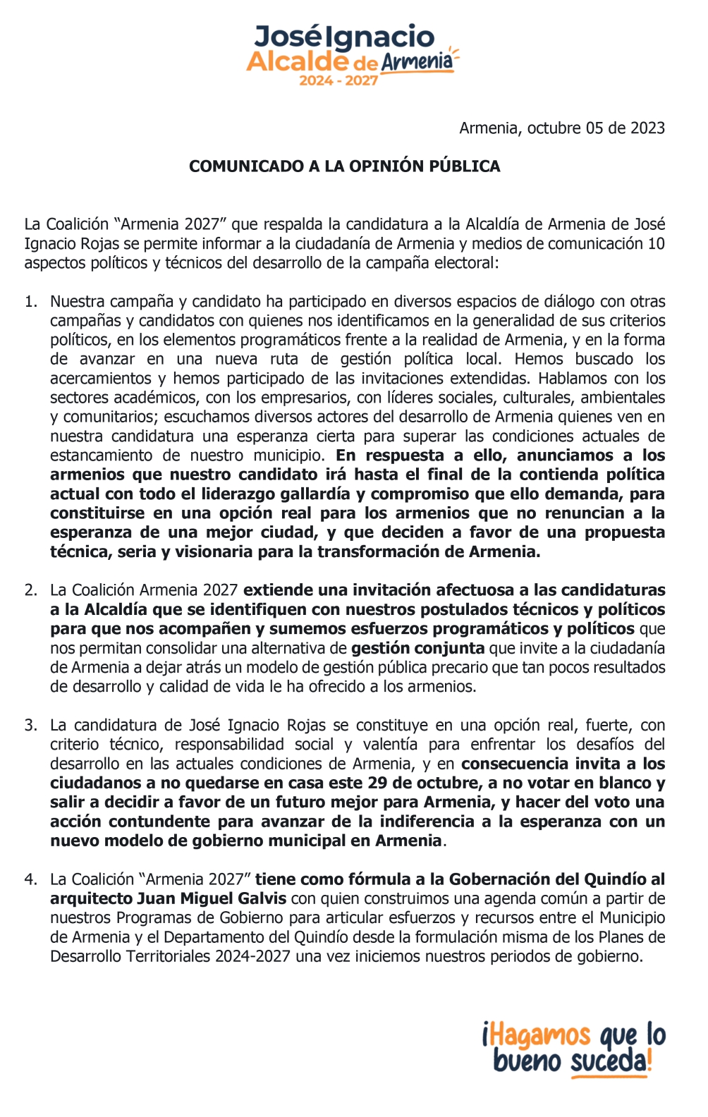 POLÍTICA Comunicado a la Opinión Pública del candidato a la alcaldía de Armenia, José Ignacio Rojas pilasarmenia 6 de octubre de 2023 Navegación de entradas Previous: ¿Y de los escenarios de los Juegos, qué?Next: Conferencia sobre deporte se cumplió en Armenia Más historias LO NUESTRO POLÍTICA Gobernación del Quindío avanza en mejoramientos de vivienda PilasArmenia 16 de noviembre de 2025 POLÍTICA Por presunto escandalo de corrupción, renuncia ministro Bonilla. PilasArmenia 6 de diciembre de 2024 POLÍTICA “divorcio exprés” PilasArmenia 6 de diciembre de 2024