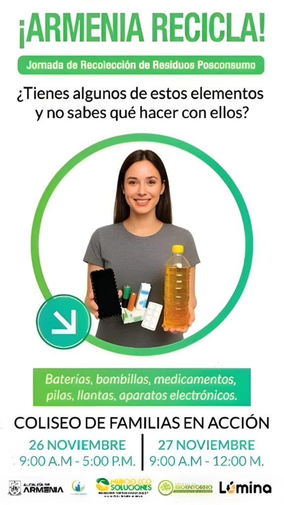 Del 26 al 27 de noviembre te esperamos en la Jornada de Recolección de Residuos Posconsumo en el Coliseo de Familias en Acción, contiguo a la iglesia San Francisco, para que aportes a una Armenia más limpia y responsable.